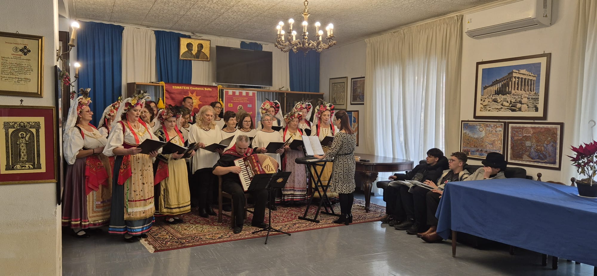 La Comunità Ellenica di Napoli e Campania ha ospitato presso la sala della Confraternita dei Nazionali Greci di Santi Pietro e Paolo la compagnia di ballo Cantore Solis di Corfù. L’evento, avvenuto oggi  1 Marzo, ha interessato membri della comunità ed appassionati della musica e delle danze tradizionali tipiche delle coste Ioniche. In quanto associazione preposta alla promozione della cultura ellenica, l’evento è stato accolto con entusiasmo ed attuato come parte del programma annuale delle iniziative culturali.